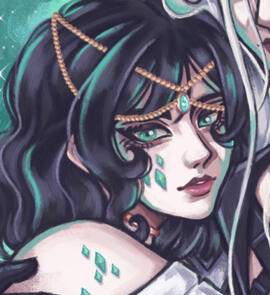 Gaia's appearance consists of a short and dark wavy hair, bright cyan eyes and mako crystals all over her pale skin.